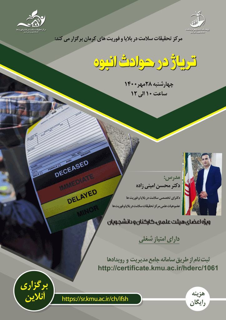 به اطلاع کلیه اعضای محترم هیات علمی، دانشجویان گرامی و کارکنان علاقمند می رساند مرکز تحقیقات سلامت در حوادث و بلایا با همکاری معاونت بهداشتی دانشگاه علوم پزشکی کرمان کارگاه تریاژ در حوادث انبوه را در تاریخ چهارشنبه 28 مهرماه راس ساعت 10 صبح برگزار می کند.