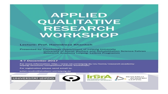 با همکاری دانشگاه لایپزیگ آلمان و دانشگاه علوم بهزیستی و توانبخشی، کارگاه مطالعات کیفی در تاریخ 3-7 دسامبر 2017 در محل دانشگاه لایپزیگ برگزار خواهد شد. این کارگاه توسط دکتر حمید رضا خانکه و با تاکید بر فراگیری شیوه های کاربردی در مطالعات کیفی ارائه می شود.